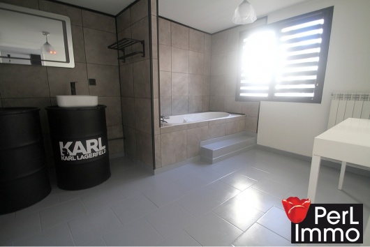 Au 1er étage, une chambre de 18 m² avec coin dressing complet et lumière avec détecteur de présences d’une surface de 8,5 m², salle de bains avec baignoire, WC indépendant, dégagement avec un placard-dressing.